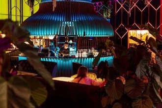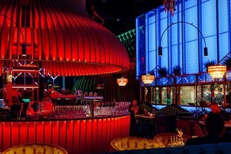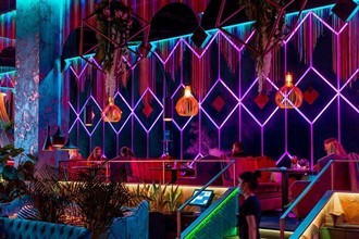 В просторном зале ресторана стильный интерьер, оформленный в красочных тонах с добавлением интересных деталей и яркой подсветки. В дизайн гармонично вплелись панорамные окна, уютные столики, мягкие диванчики и кресла, где могут с комфортом расположиться гости.